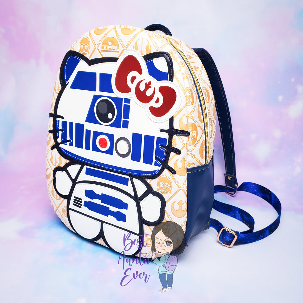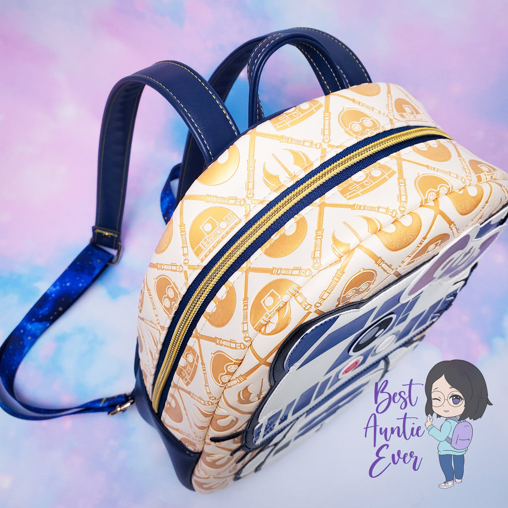 Beep. Boop. Beep. Accented in robotic blue vinyl, with premium metallic hardware. Cotton woven lining, with inside zip & slip pockets. Adjustable straps.