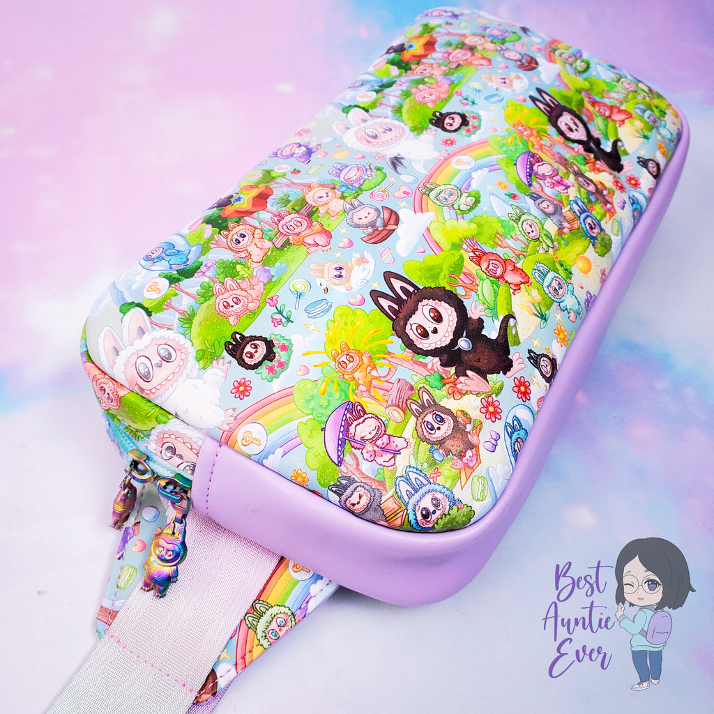 Your new console is bigger, so our new sling bag is now larger and wider to accommodate your gaming needs! Large exterior slip pocket to quickly slide your phone or console into, when you are on the go. This bag is large enough to bring along all the essentials you need, and includes an interior slip pocket. Accented in vinyl, with a water resistant lining for your active lifestyle. Crossbody strap is adjustable. Yes - it does fit your larger Switch 2!